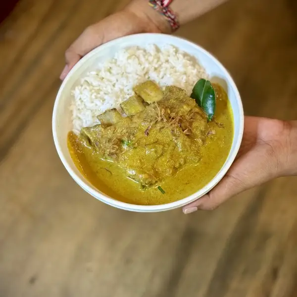 Yellow curry coconut pork ribs served with steam rice and cripy shallot