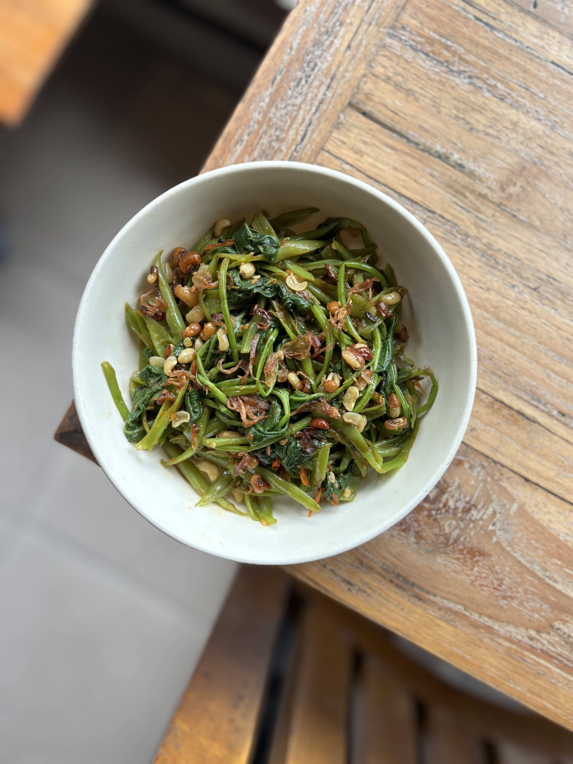 Steam spinach with balinese chili tomato pure, crispy shallot and balinese nut